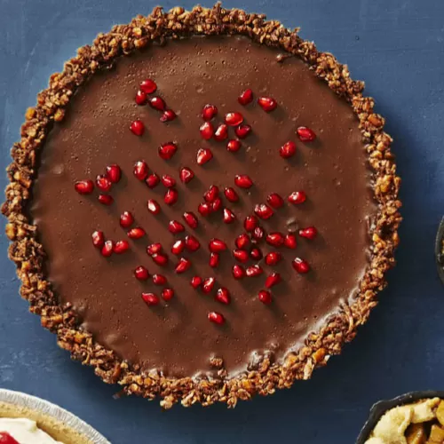 Preheat oven to 375°F. Grease 9” tart pan with removable bottom. In large bowl, combine shredded coconut, pretzels, rice flour, coconut oil, sugar, and cocoa. Transfer to prepared tart pan. With hands, firmly press mixture into bottom and up side of pan in even layer; place on cookie sheet. Bake 10 minutes. Cool completely on wire rack. In small saucepan, heat coconut milk on medium until just bubbling at edges, whisking occasionally. Place chocolate and pinch salt in medium heatproof bowl. Pour hot coconut milk over chocolate. Let stand 5 minutes. Gently whisk until smooth. Pour into tart shell. Refrigerate, uncovered, 2 hours or until set. To serve, top with pomegranate seeds, if desired. Can be made up to 2 days ahead. Once set, cover with plastic and keep refrigerated.