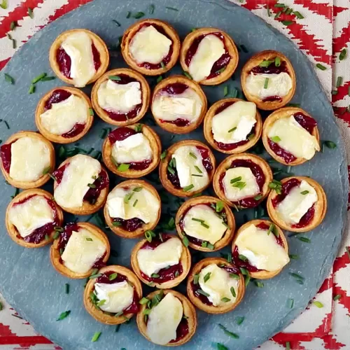 Add 1 teaspoon cranberry sauce to each cup, then top with a piece of Brie. Return to the oven and bake until the sauce is hot and the cheese has melted, about 5 minutes more. Let cool for 10 minutes. Sprinkle with chives, if desired, and serve warm.