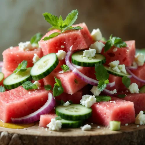 Enjoy the perfect balance of sweet, juicy watermelon, tangy cucumbers, and creamy feta in this refreshing summer salad. It’s a vibrant, easy-to-make dish that’s ideal for picnics, barbecues, or a light lunch on a hot day!